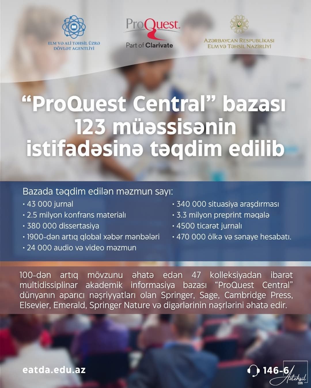 AzTehsil.com xəbər verir ki, tam mətnli akademik informasiya bazası olan “ProQuest Central” Elm və Təhsil Nazirliyi ilə Clarivate şirkəti arasında bağlanmış müqavilə əsasında 123 müəssisənin istifadəsinə təqdim edilib.
