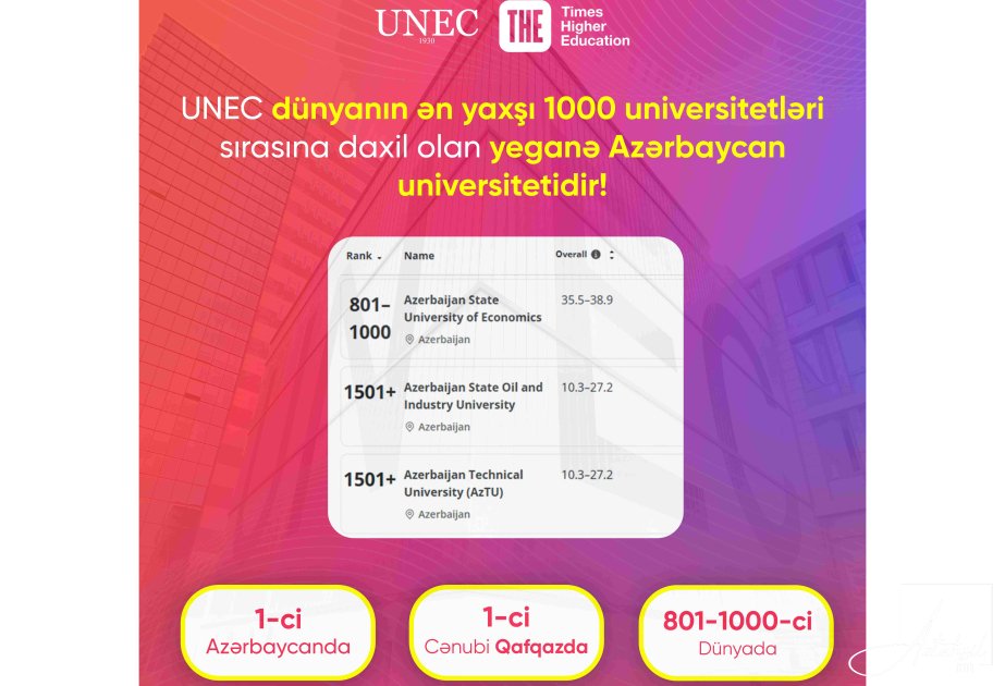THE dünya universitetlər reytinqinə bu il ilk dəfə daxil olan UNEC Azərbaycanda birinci, Cənubi Qafqazda birinci, dünyada isə 801-1000-ci yerə yüksəldi.