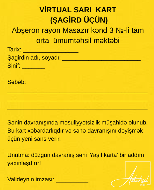 Məsələ ilə bağlı Abşeron-Xızı Regional Təhsil İdarəsinə sorğu ünvanladıq. Qurumdan müraciətimizə cavab olaraq bildirildi ki, ümumi təhsil müəssisəsinin daxili intizam qaydaları pedaqoji şurada müzakirə edildikdən sonra müəssisə rəhbərinin əmri ilə təsdiq edilir, həm şagirdlər, həm də valideynlər intizam qaydaları ilə tanış edilir: “Bir çox təhsil müəssisəsində ötən iki ildə tətbiq edilmiş “virtual kart”lar hazırda demək olar ki, bütün təhsil müəssisələrinin intizam qaydalarında təsbit edilib. Burada məqsəd şagirdlərdə intizam, sosial məsuliyyət, davranış mədəniyyəti formalaşdırılmasına dəstək vermək, məktəbdə sağlam mühit formalaşdırmaqdır. Tətbiq olunan virtual sarı və qırmızı kartlar cəza vasitəsi deyil — bu mexanizm intizam pozuntularının qeydiyyatı, təhlili və şagirdlərə vaxtında pedaqoji-psixoloji dəstəyin göstərilməsi üçün nəzərdə tutulub.