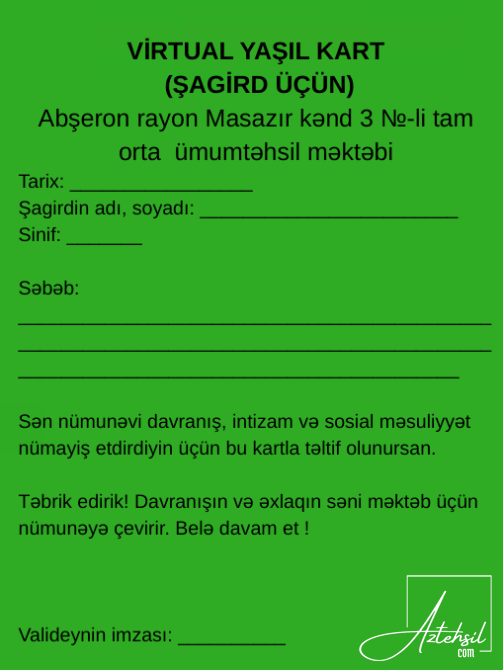 Abşeron rayonu Masazır qəsəbəsində yerləşən 3 №-li tam orta məktəbdə şagirdlərin davranış və dərs nailiyyətlərinin sarı, qırmızı və yaşıl kartlarla qiymətləndirilməsi valideynlərin narazılığına səbəb olub.
