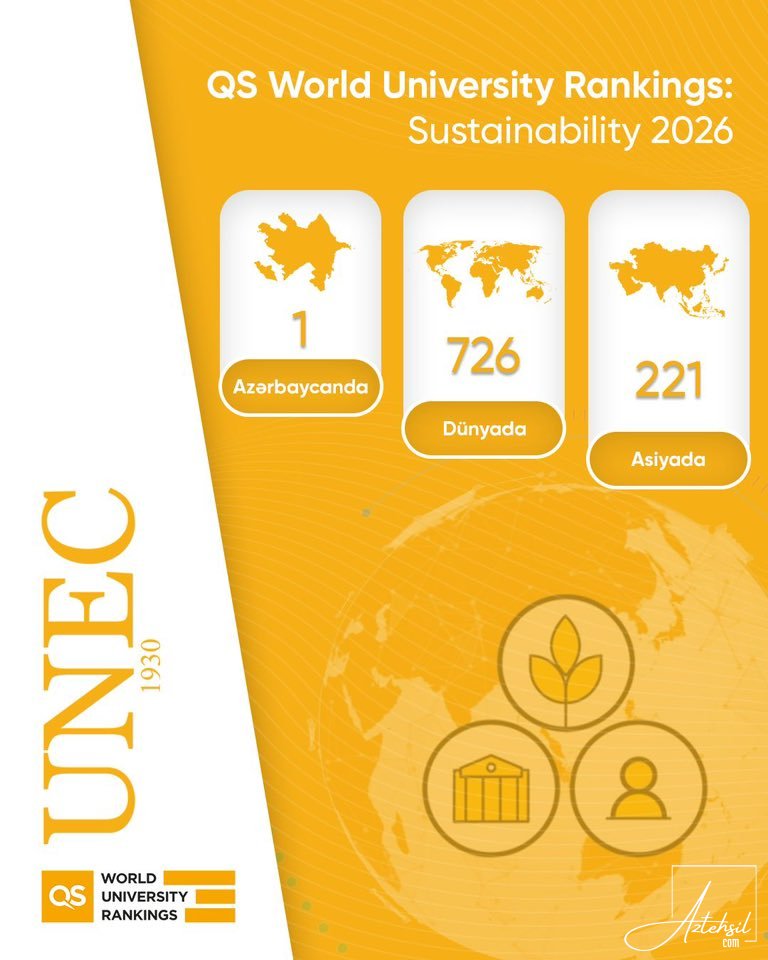 Modern.az xəbər verir ki, dünyanın ən nüfuzlu reytinq agentliklərindən biri olan QS (Quacquarelli Symonds) tərəfindən açıqlanan “Dünya Universitetlərinin reytinqi: Dayanıqlılıq 2026” (“World University Rankings: Sustainability 2026) nəticələrinə əsasən, UNEC dünyada ən yaxşı 726-cı, Asiyada 221-ci, Azərbaycanda isə 1-ci universitetdir.
