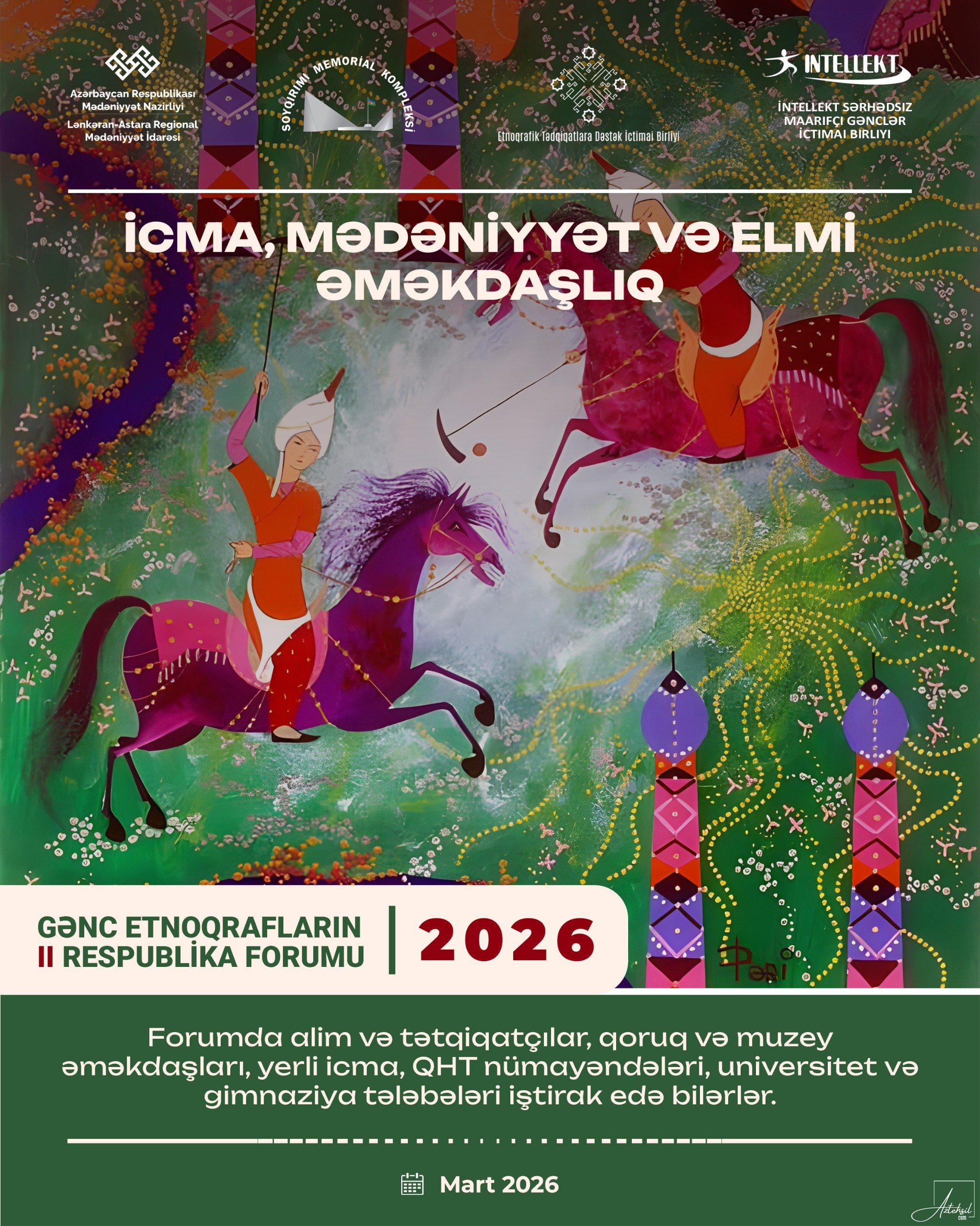 16–17 mart 2026-cı il tarixlərində Lənkəran şəhəri “İcma, Mədəniyyət və Elmi Əməkdaşlıq” mövzusunda Gənc Etnoqrafların II Respublika Forumuna ev sahibliyi edəcək. Forum Etnoqrafik Tədqiqatlara Dəstək İctimai Birliyinin təşkilatçılığı, “Soyqırımı Memorial Kompleksi” (Quba), Lənkəran Regional Elm Mərkəzi və “İntellekt” Sərhədsiz Maarifçi Gənclər İctimai Birliyinin dəstəyi ilə keçiriləcək.