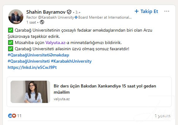 Müsahibəni Linkedin hesabında paylaşan Universitetin rektoru Şahin Bayramov isə yazıb: "Qarabağ Universitetinin çoxsaylı fədakar əməkdaşlarından biri olan Arzu Şükürovaya təşəkkür edirik. Müsahibə üçün Valyuta.az-a minnətdarlığımızı bildiririk. Qarabağ Universiteti ailəsinin üzvü olmaq sonsuz fəxarətdir!"